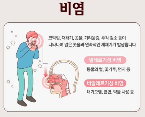 - 비염은 주로 알레르기, 바이러스 감염, 환경적 요인(먼지, 꽃가루 등)에 의해 발생합니다.