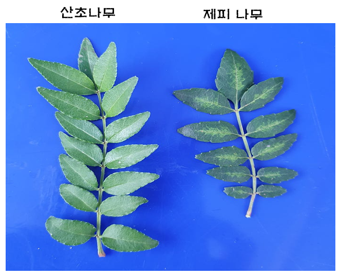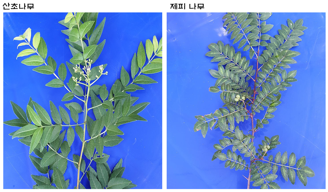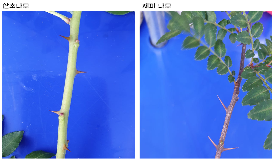 1. 산초와 제피는 잎과 열매가 비슷하지만, 가지의 가시 배열이 다르다.