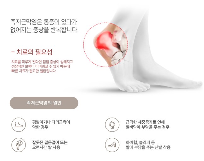 과도한 운동: 장시간 서 있거나 달리기, 걷기 등의 운동을 과하게 할 경우 족저근막에 무리가 가해져 염증이 발생할 수 있습니다.