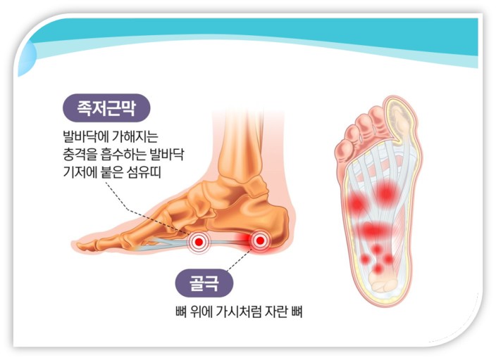 족저근막염은 염증성 질환으로 안정적인 치료가 필요하며 통증 관리가 중요합니다. 만성화된 경우 통증이 발 전체로 퍼져나갈 수 있으므로 조기 치료가 핵심입니다.